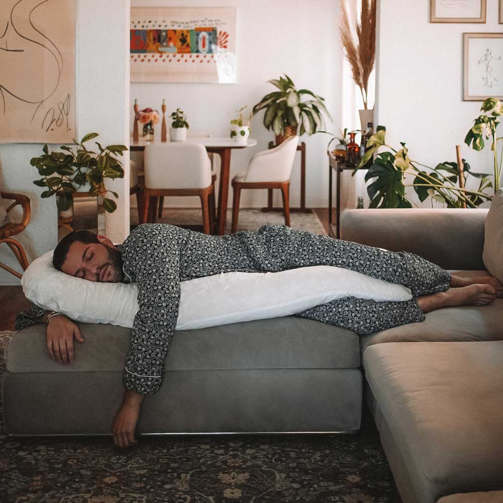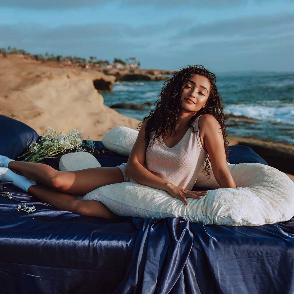 Yana’s unique shape bends and flexes to support you anyway you sleep-- without crowding the bed. What to do when you wake up? Twist Yana into a decorative pouf - or wrap around your torso for luxe lounging all day long.