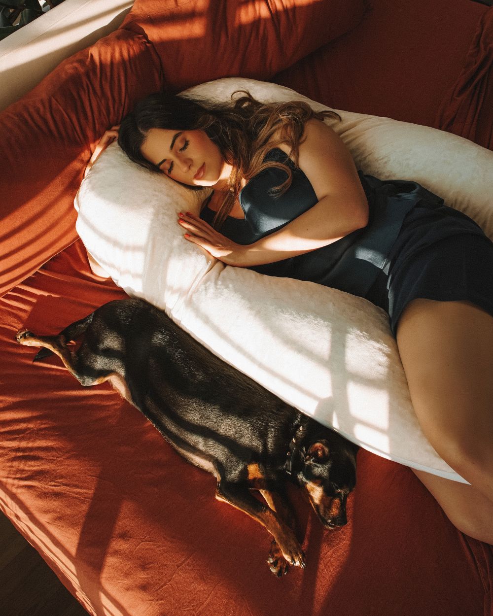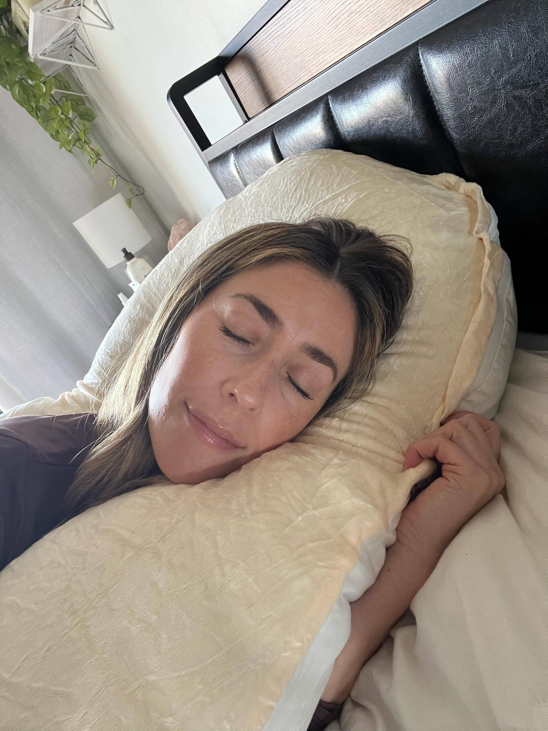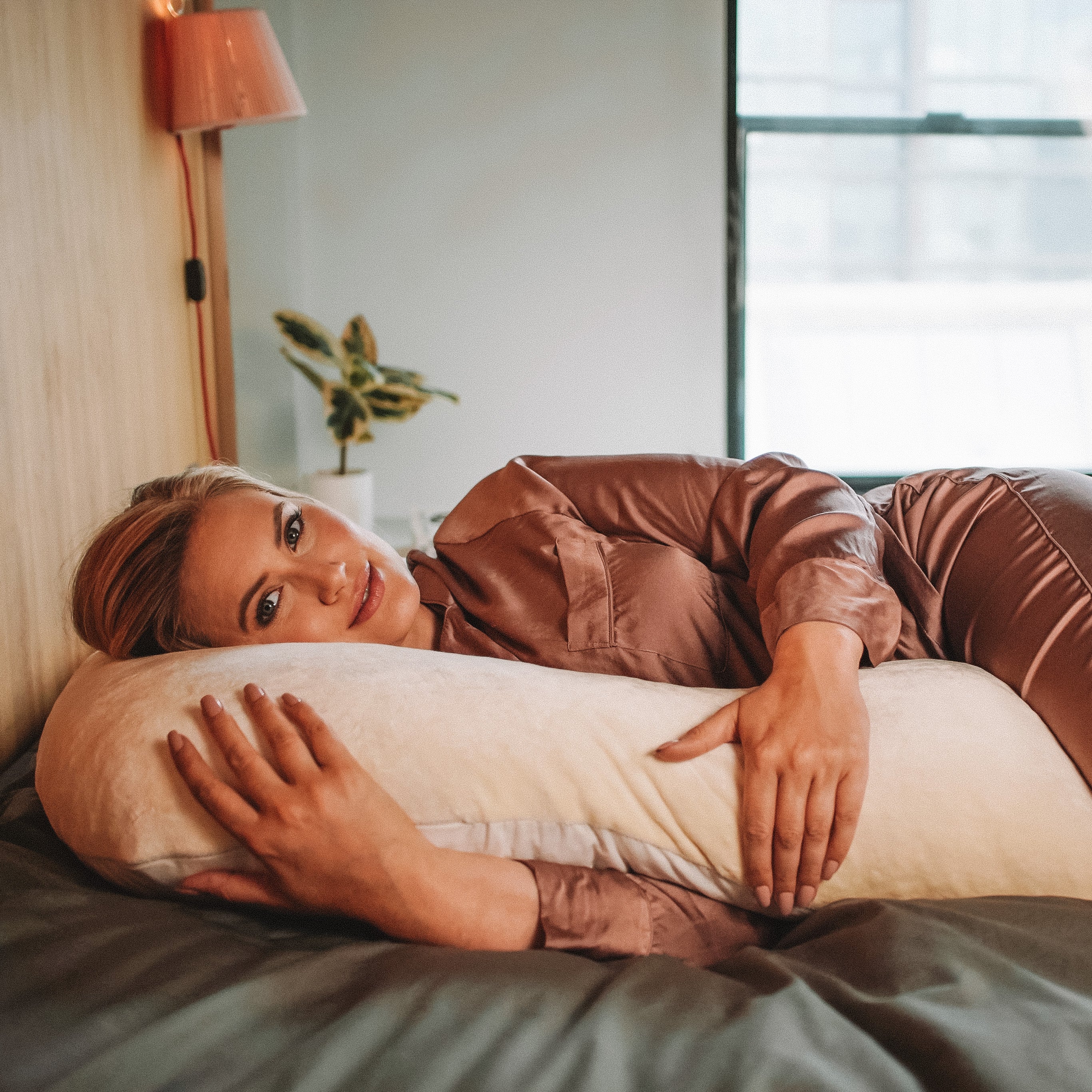 “I used to wake up 4–5 times a night. Now I sleep straight through. This thing is like a weighted blanket, pillow, and cuddle buddy all in one.” — Emily R.